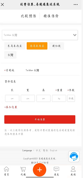 哪很多小夥伴肯定會問到手機端要如何操作呢,其實手機端的話也是一樣哦,首先我們可以關註我們集運公司的一個公眾號,這時小夥伴進入公眾號也是在首頁可以看到運費估算的,這時有需要的小夥伴可以點擊進去選擇精準估價選擇需要發往的目的國家輸入貨件信息即可,如下圖所示哦。